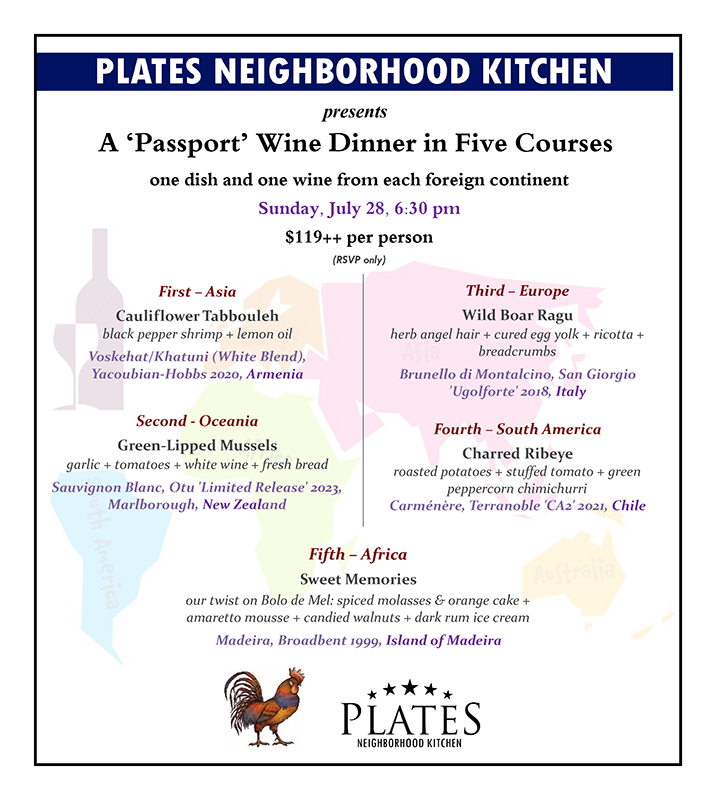 On the evening of Sunday, July 28, Plates Kitchen goes out in style with an exclusive five-course Wine Dinner with a ‘Passport’ theme – no passport required! Chef David Mitchell presents an exciting menu of delicious, globally inspired dishes, each from a different foreign continent. Wine Director Justin Gallus will expertly pair each course with a stunning wine selection from the country that inspired the dish.