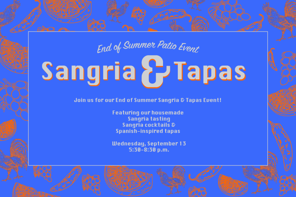 Please make plans to join us at Plates Kitchen on the evening of Wednesday, September 13 for our end of summer Sangria & Tapas Pairing Night!